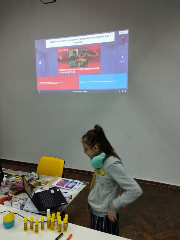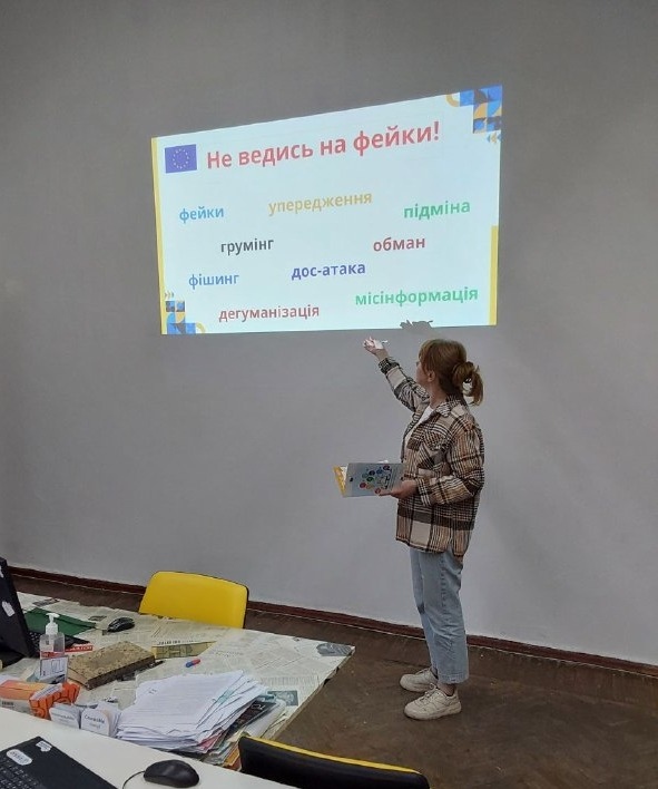 Спочатку юні клубівці разом із координаторкою переглянули навчальні відео про цифрову безпеку, потім детально обговорили як працює дезінформація в медійному просторі, навчились розпізнавати неправдиві новини, шукали в соцмережах фейкові повідомлення про відносини ЄС та України, думали чому зростає кількість хибних фактів про Україну в медіа.